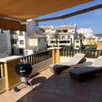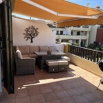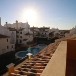 Large main Patio overlooking the square and the communal swimming pool, with sun lounges , L shaped corner sofa with convertible Dining table/coffee table Twin roller sun shades.