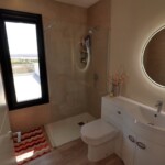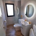 Its elaborate finish includes an electric sliding main gate before arriving at the large, paved driveway. A large grey front door opens to an entrance hall which leads to two ground floor, fully fitted bedrooms (each with its own ensuite bathroom), plus an additional guest toilet. The layout of this modern villa is light and airy with underfloor heating throughout for the cooler winter months. A good-sized open plan living, dining room and kitchen flows naturally across the width of the villa. The villa is sold furnished including a fully fitted modern kitchen complete with a free-standing central island. Tinted glass sliding doors open on to a large, covered terrace with steps leading to the swimming pool. This villa is also equipped with its own separate entertainment area on the ground floor which includes a bar.